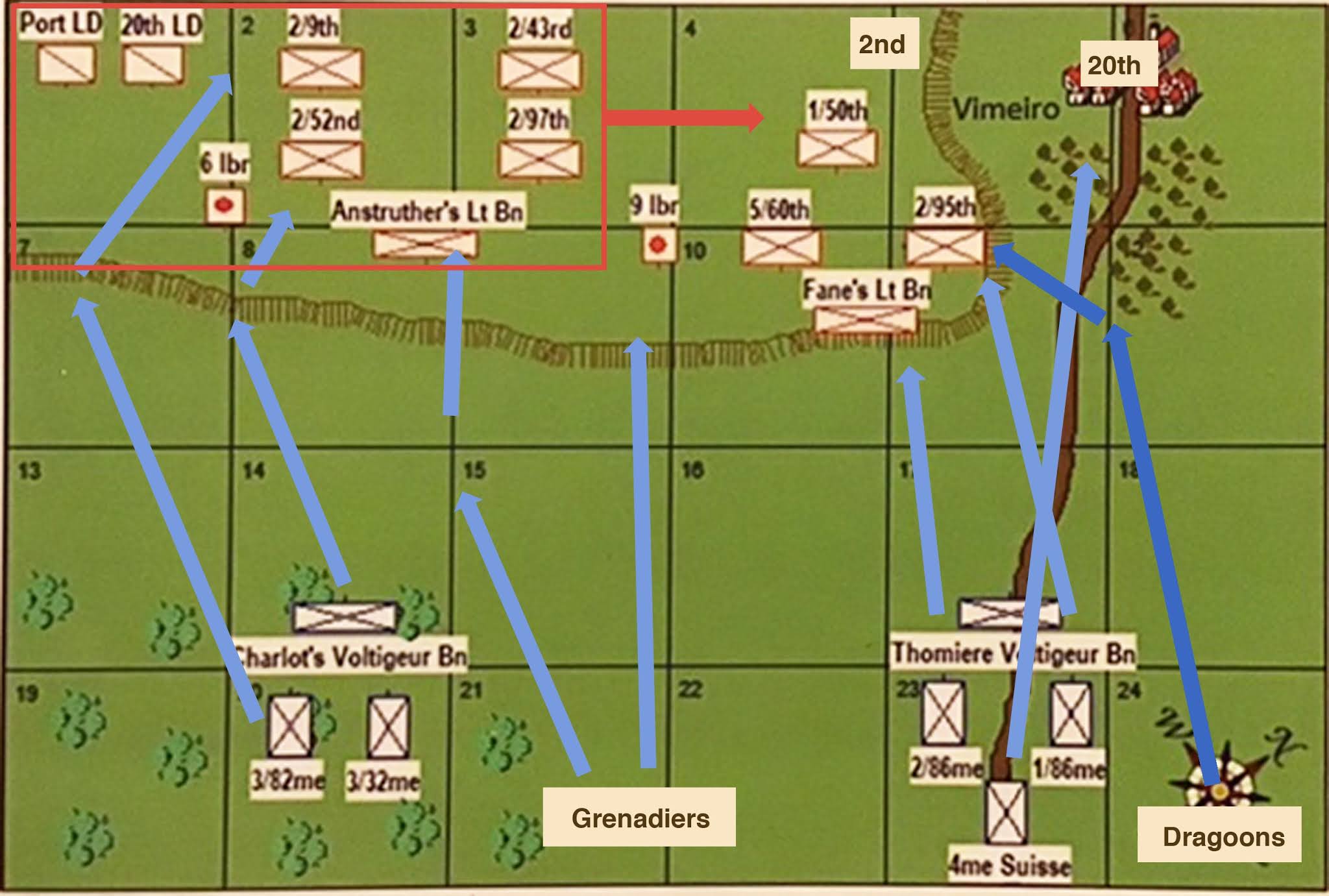 Bottom right Acland’s skirmishers have moved into the orchards in front of Vimeiro to harass the French Dragoons’ flank.